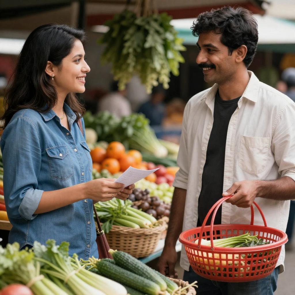 A young Indian couple standing at an outdoor fresh produce market. The woman on the left is wearing a blue denim shirt and holding a shopping list, smiling at the man. The man on the right is dressed in a white button-up shirt over a black t-shirt and holding a red shopping basket filled with vegetables. Colorful fresh vegetables and green plants are visible in the background.