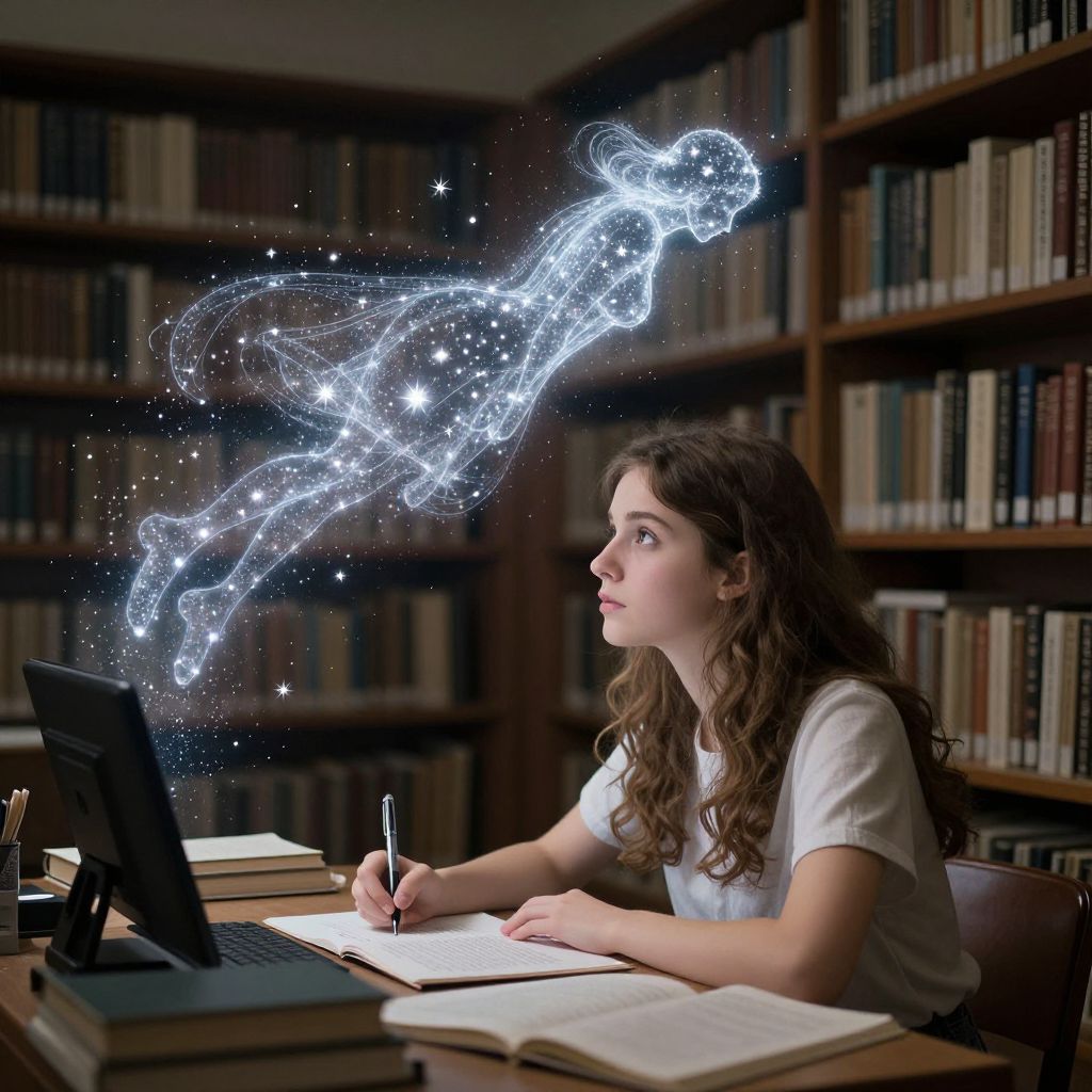 Photograph of a young woman with wavy brown hair, wearing a white short-sleeved shirt, seated at a wooden desk in a dimly lit library. She is writing in a notebook while looking at a laptop. Above her head, a glowing, ethereal blue constellation of stars and a figure resembling a leaping deer trails upwards. The background features tall, dark wooden bookshelves filled with books. The image blends realism with fantasy, highlighting the creative and imaginative atmosphere. The woman's focused expression contrasts with the magical, luminous figure above her.