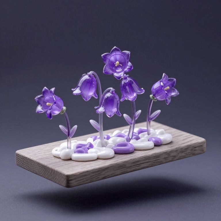 Flat a bellflowers made of semi-transparent purple glass, white glossy stuff, and ash wood, floating in the air, moody background, serene mood, soft lighting,