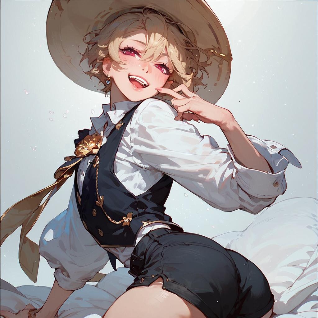 Score_9, score_8_up, score_7_up, best quality, highest score, anime art stylefemboy, black shorts, black vest, white shirt, hat, looking back at viewer, grin, tongue out