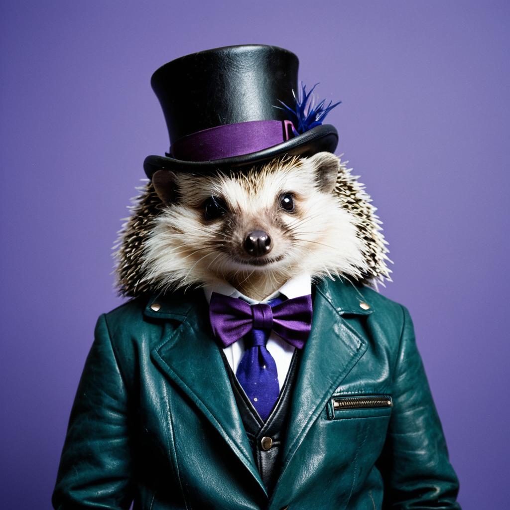 Hedgehog wearing a worn leather biker jacket, portrait photo, rim-lit, pastel background with swirling cobalt blue and rich purple, studio photo, wearing a dark green tailored suit, smart silk bow tie and tall vintage tophat
