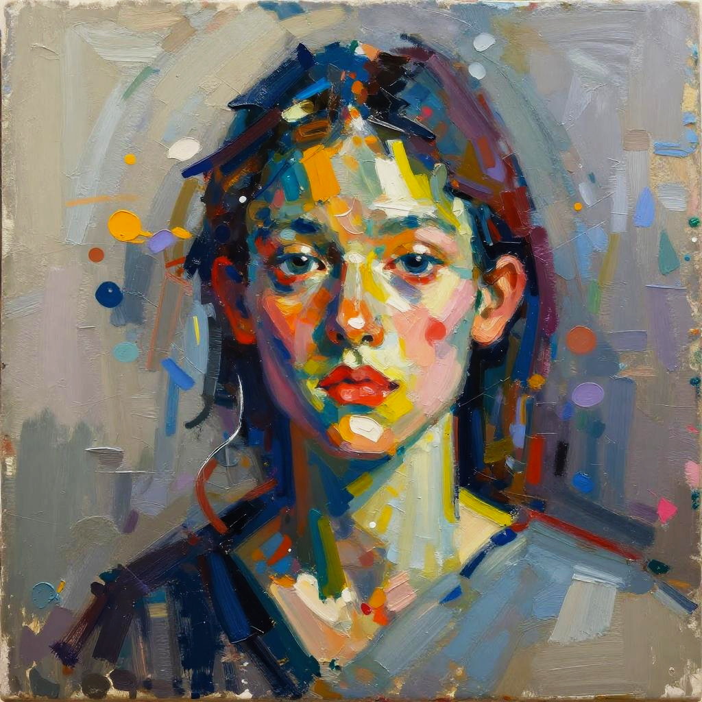Vibrant abstract oil painting of a young woman with dark hair, colorful splashes, and intense expression, set against a blurred background.
