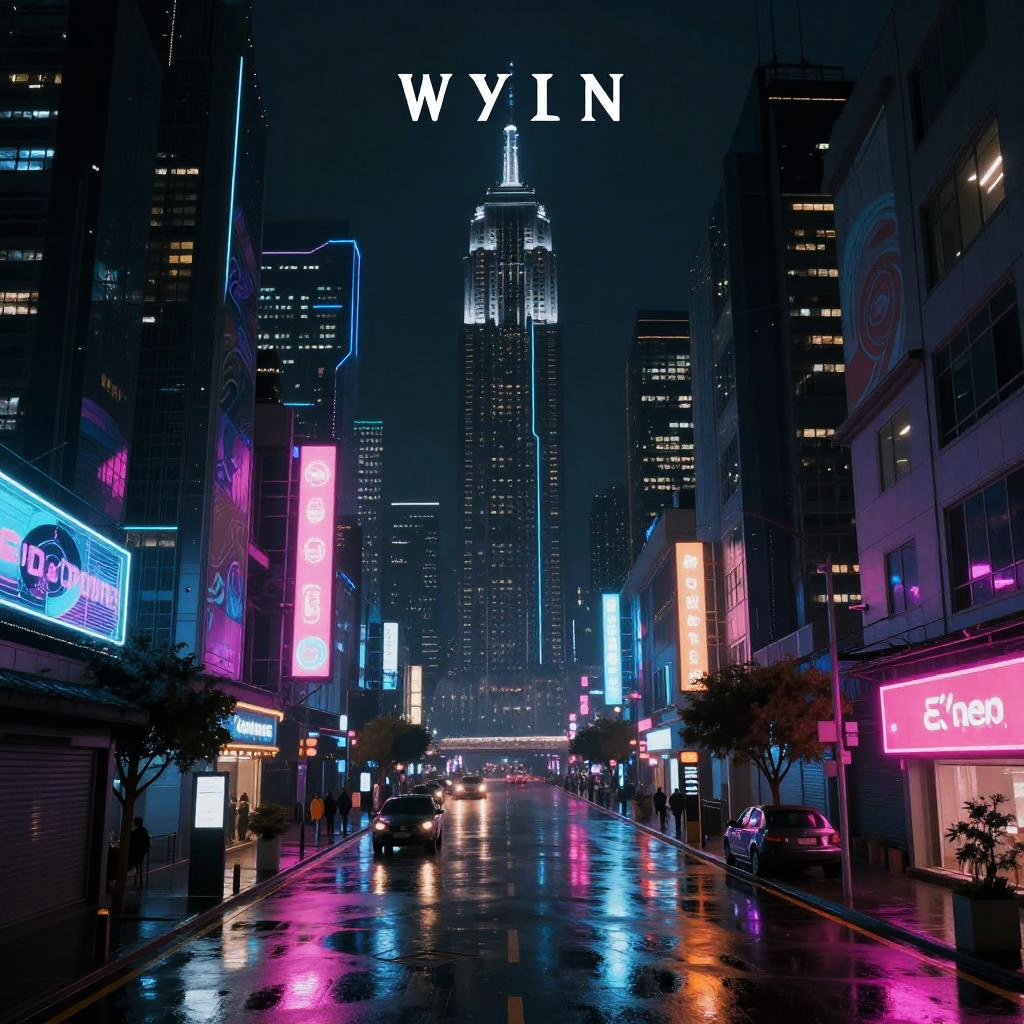 This is a digital artwork depicting a neon-lit, rainy city street at night. The centerpiece is the illuminated Empire State Building, with "WYN" in bold white letters above it. The street reflects vibrant blue, pink, and purple neon lights from various signs, including "Cinema" and "Close." The street is wet, mirroring the lights. Tall buildings with glowing windows frame the scene, creating a futuristic urban atmosphere. The overall color palette is dark with bright, contrasting neon hues, evoking a cyberpunk style. The image has a glossy, reflective texture, enhancing the wet street effect.