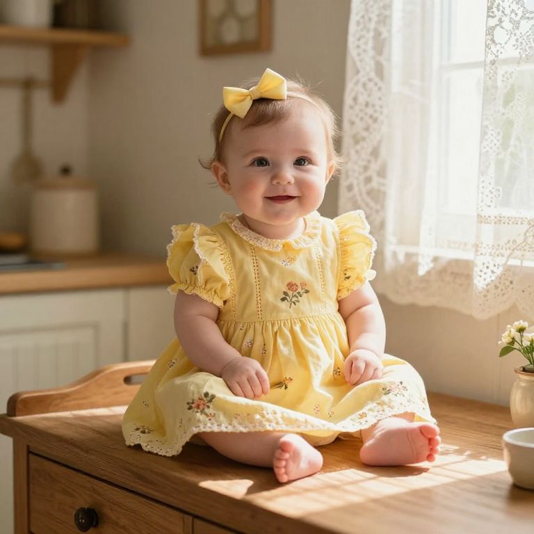 A baby girl in a vintage-style yellow newborn dress, posing on a wooden changing table in a cozy farmhouse kitchen, sunlight shining through lace curtains, her face round and sweet with a small smile, wearing a tiny yellow bow and the dress having a floral printed pattern with delicate stitching.