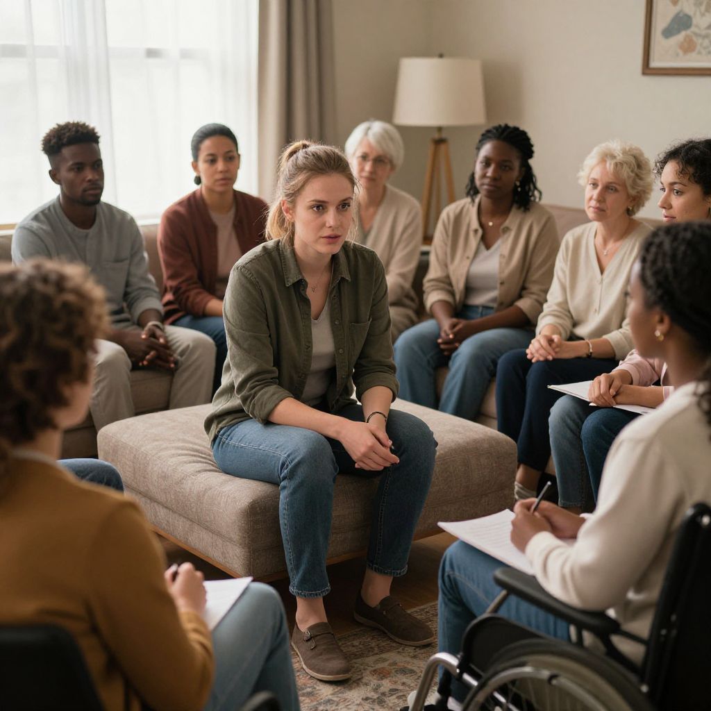 Photograph of a diverse group of eight people, seven seated and one partially visible in a wheelchair, in a cozy living room. The central focus is a young white woman with blonde hair in a ponytail, wearing a green button-up shirt and blue jeans, sitting on a beige ottoman. She looks serious and attentive. The background includes a window with soft light, beige walls, a tall lamp, and a framed artwork. The group includes men and women of various ethnicities and ages, dressed casually in sweaters, jeans, and jackets. They are engaged, holding papers and notebooks. The atmosphere is informal and supportive.
