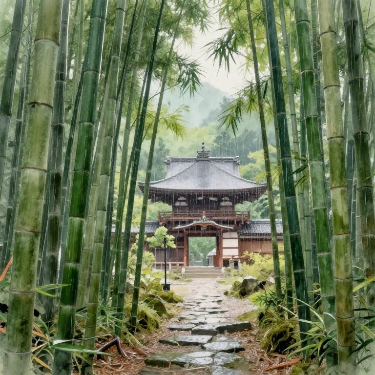 Rainy Day in Bamboo Forest with Japanese Temple