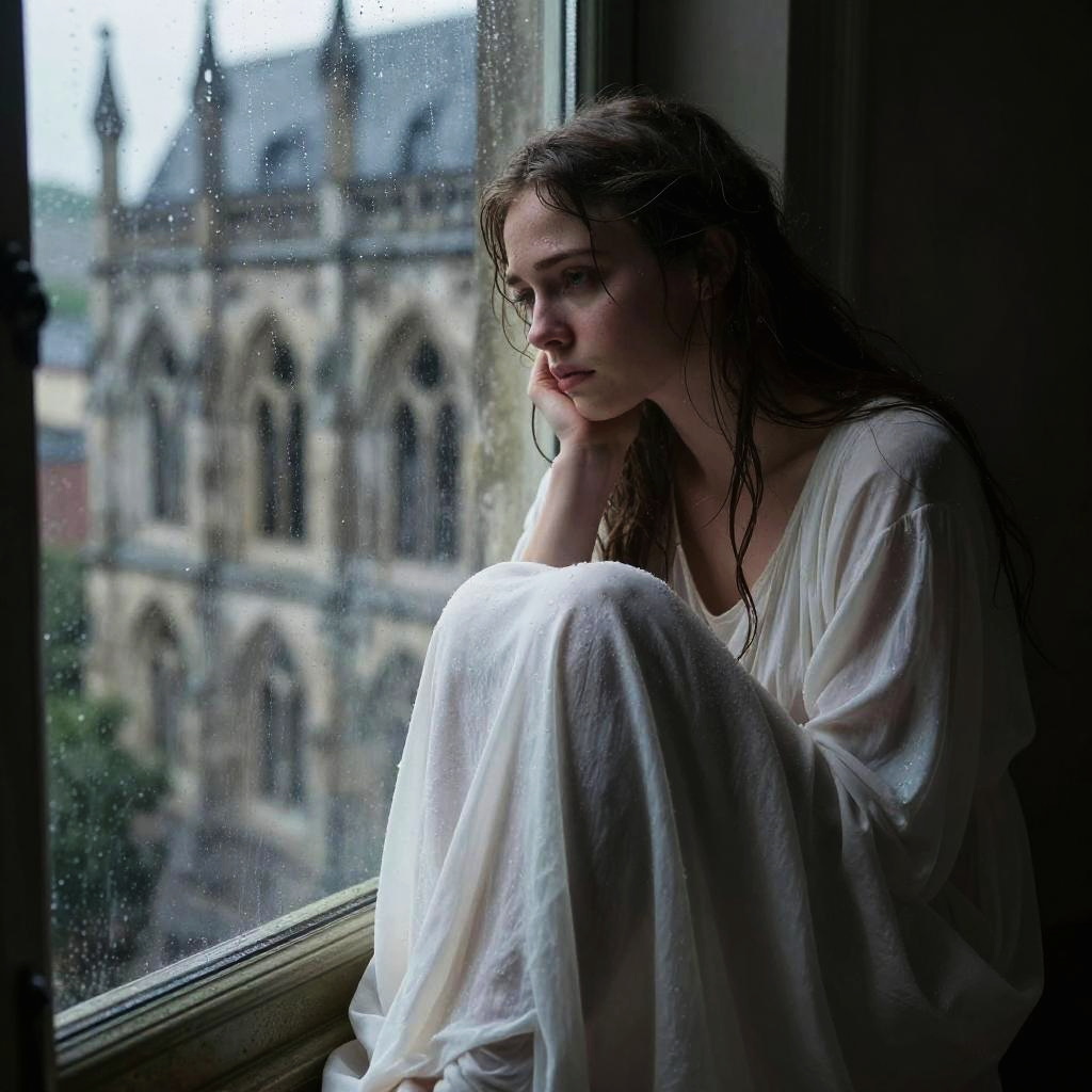 Juliet sad gazing out a rain-streaked window, melancholy expression, flowing white gown soaked slightly, muted colors, gothic architecture background, emotional and atmospheric scene