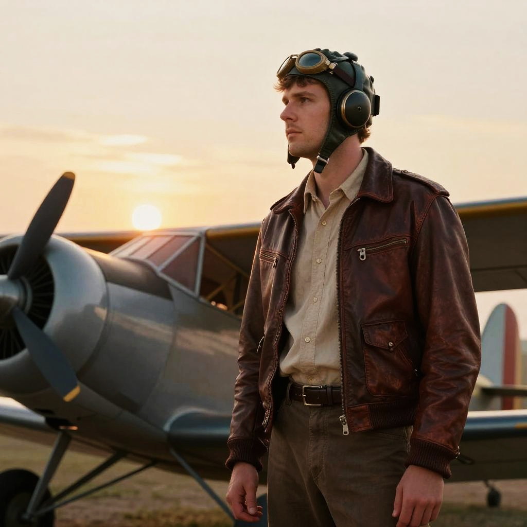 Photo of a vintage pilot in leather jacket, beside an old airplane at sunset, in the style of Norman Rockwell, with golden hour warm light, Blender, cinematic depth of field