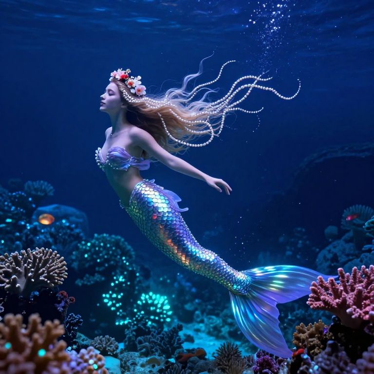 An enchanting underwater realm bathed in radiant bioluminescence, reminiscent of James Cameron's cinematic vision, unfolds before the viewer. The camera perspective offers an intimate glimpse into this mesmerizing world, highlighting intricate textures and vibrant colors that envelop the senses. In this mystical aquatic kingdom, a graceful mermaid princess glides effortlessly through the depths, her flowing hair shimmering like strands of pearls. Adorned in a crown artfully crafted from sea blossoms, she embodies tranquility as she dances amidst the glowing coral reefs. Her ethereal gown, fashioned from scales that refract light with every movement, casts an enchanting spell over all who witness this captivating scene, inviting them to lose themselves in the wonder and mystery of this otherworldly realm.