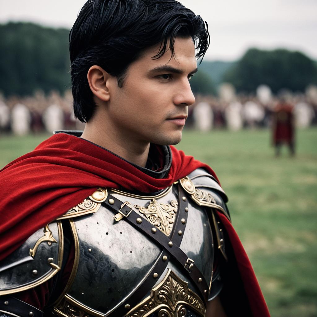 Roman warrior costume,armor, solo, realistic, blurry background, blurry, looking at viewer, 1boy, shoulder armor, male focus, black hair, upper body, red cape