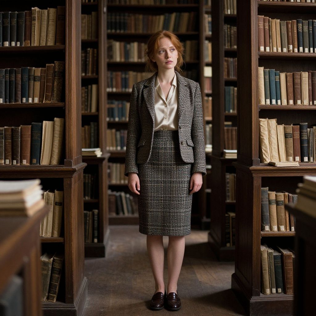 Photograph of a red-haired woman standing in a dimly lit library aisle. She wears a black-and-white checkered tailored suit with a white satin blouse, and black leather loafers. Her hair is loosely pulled back, and she looks directly at the camera with a neutral expression. The background features tall wooden bookshelves filled with numerous books, arranged vertically and horizontally. The shelves are dark brown, and the books have varied colored spines. The floor is wooden, and the overall atmosphere is scholarly and quiet. The lighting is soft, highlighting the woman and casting gentle shadows.