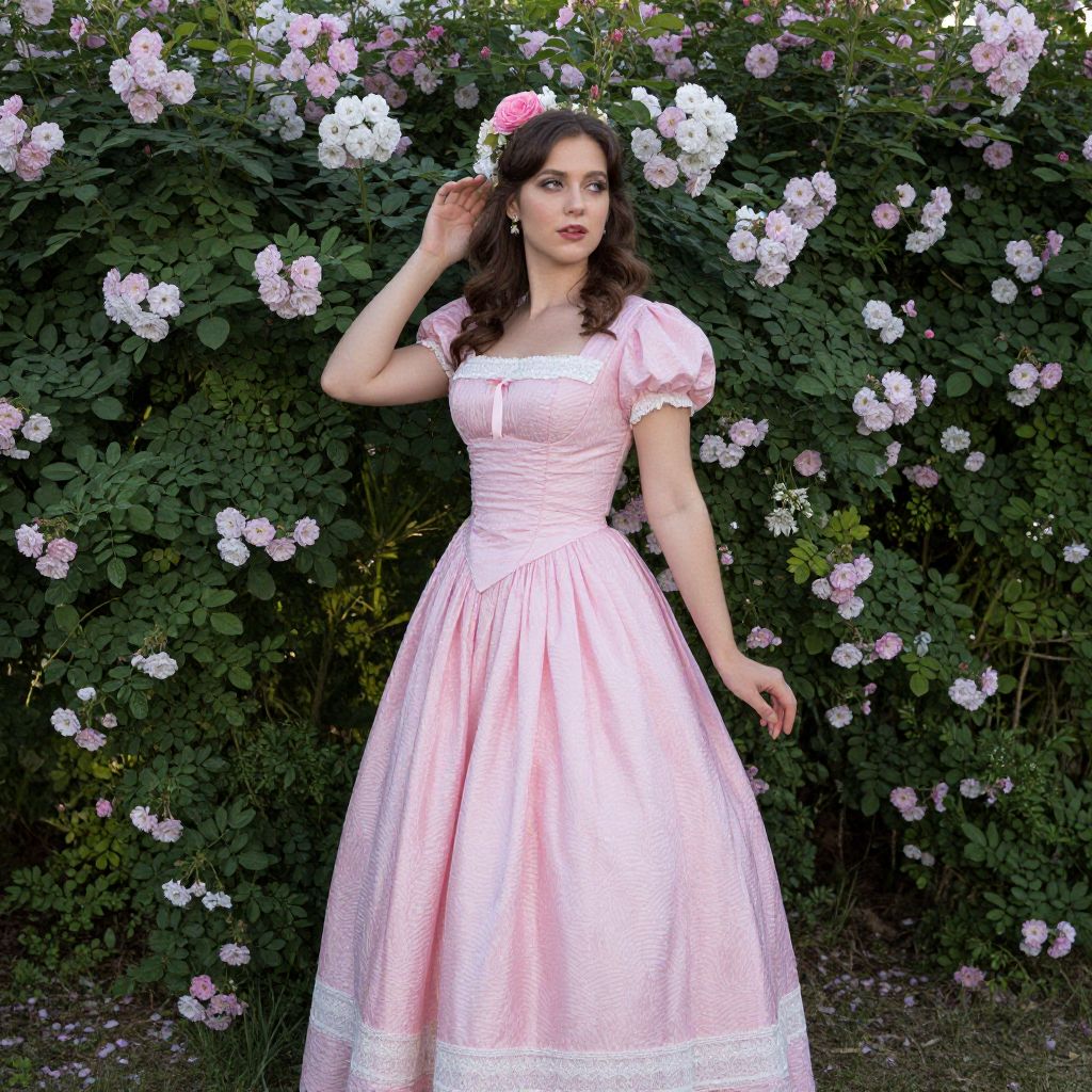 Rose Fancy Dress, woman in a pink dress standing in front of a bush of roses