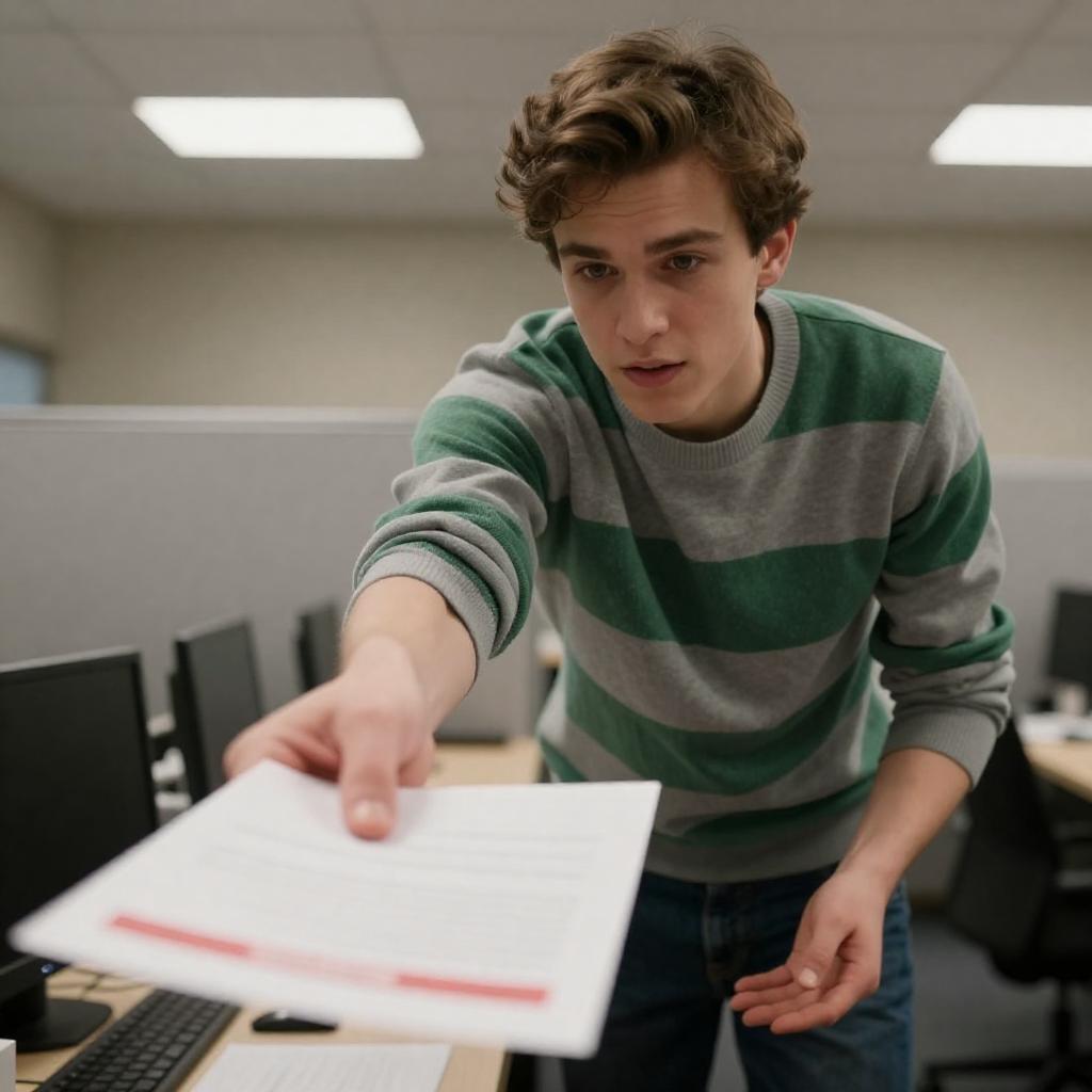 Photograph of a young man with short brown hair, wearing a striped green and gray sweater, extending his right arm to hand over a white paper with red accents. He is leaning forward in a dimly lit office cubicle with gray walls and fluorescent lighting. His left hand is open, palm up.