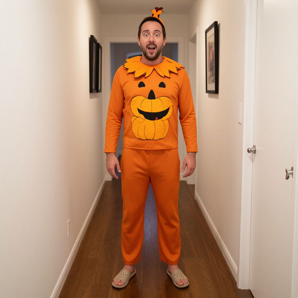 Photograph of a man standing in a narrow, white-walled hallway with dark wooden floors. He has a medium build, light brown skin, and short black hair with a beard. He wears an orange Halloween costume with a jack-o'-lantern face on the shirt and pants, including leaf-like shoulder adornments and a small pumpkin hat. His wide-eyed, surprised expression reveals his teeth. He is also wearing beige flip-flops. The hallway features two framed pictures on the left wall and a closed white door on the right. The image is brightly lit, emphasizing the vivid orange of the costume.
