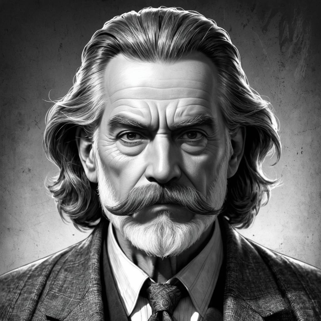 1boy, male focus, solo, traditional media, facial hair, monochrome, beard, old, portrait, graphite (medium), holding, old man, looking at viewer, mustache, cigar, greyscale, thick eyebrows, wrinkled skin, mature male, hatching (texture), long hair