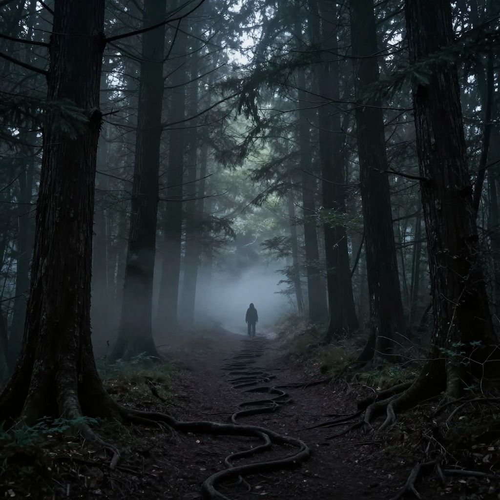 Dark creepy forest path winding through towering blackened trees, creeping mist swirling around roots, faint silhouette of a shadowy figure, atmospheric and chilling