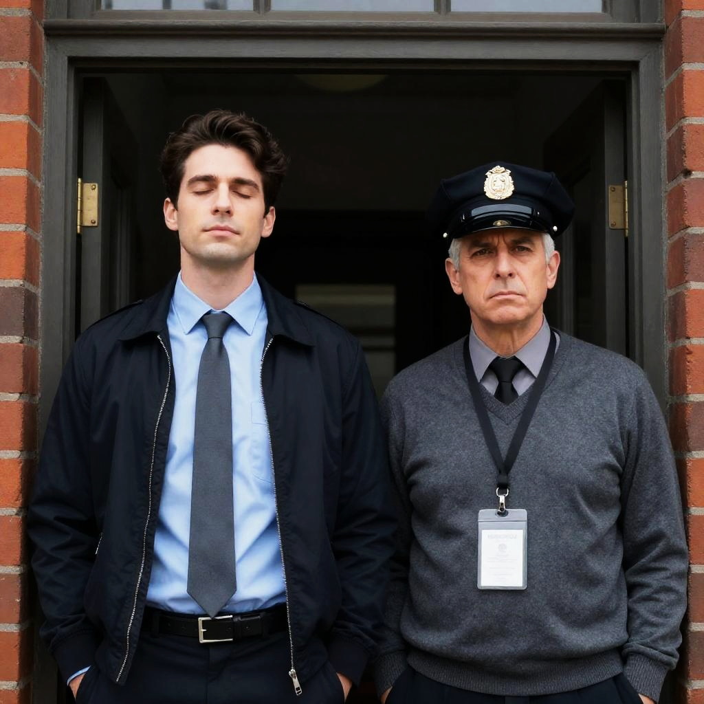Photograph of two men standing in a doorway. Left man with dark hair, black jacket, light blue shirt, gray tie, closed eyes, relaxed expression. Right man with gray hair, police cap, gray sweater, black tie, lanyard, serious expression. Brick building in background, dark hallway inside.