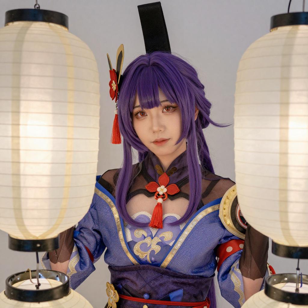 Photograph of an Asian cosplayer with long purple hair, wearing a black hat, blue and gold traditional Chinese-style outfit with red floral accents, and a beige chest piece. White, glowing paper lanterns frame the sides of the image, partially obscuring the cosplayer's face and upper body. The background is a plain white wall.