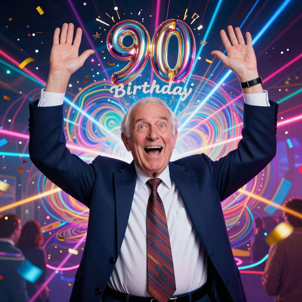 [[man,happy 90th birthday]]Intense, colorful, abstract composition: A beaming elderly gentleman, dressed in formal attire, celebrates his 90th birthday amidst an electrifying environment of pulsating laser beams, swirling patterns, and radiant hues. His face radiates joy, as he raises his arms to the sky, surrounded by a futuristic party scene filled with confetti, Man has masculine face and piercing eyes