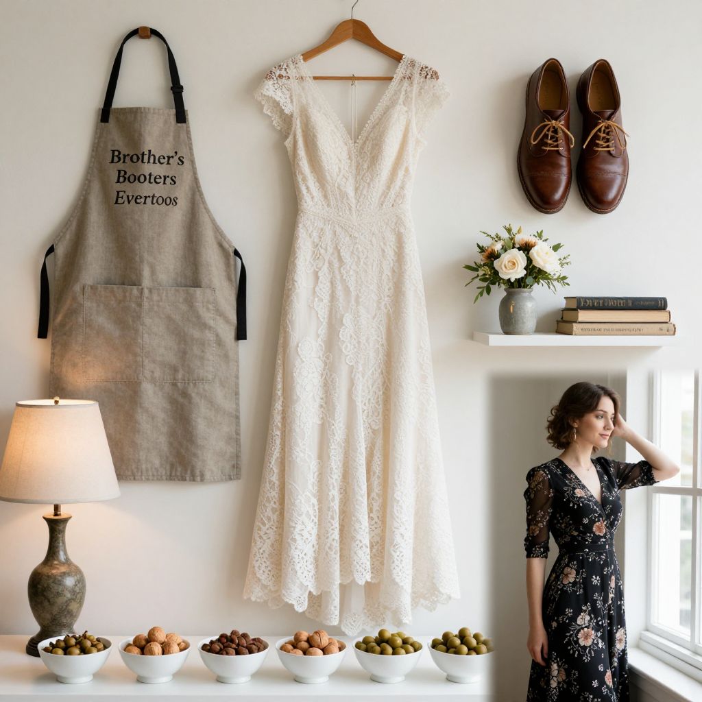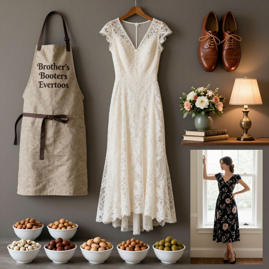Elegant vintage-inspired wedding inspiration featuring a lace dress hanging centrally, flanked by a rustic apron with \"Brother's Booters Evertoos\" text above, brown leather shoes with tan laces to the right, a lamp with a floral arrangement and books below, a woman in a black floral dress posing near a window to the bottom right, and an assortment of white ceramic bowls filled with nuts and olives arranged neatly below.