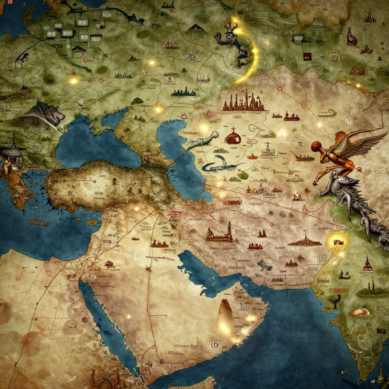 Alexander the Great conquest map rendered as a fantasy-style cartographic masterpiece, combining mythological creatures at borders, intricate iconography representing battles, kingdoms, cities, and trade routes, aged parchment colors with glowing highlights