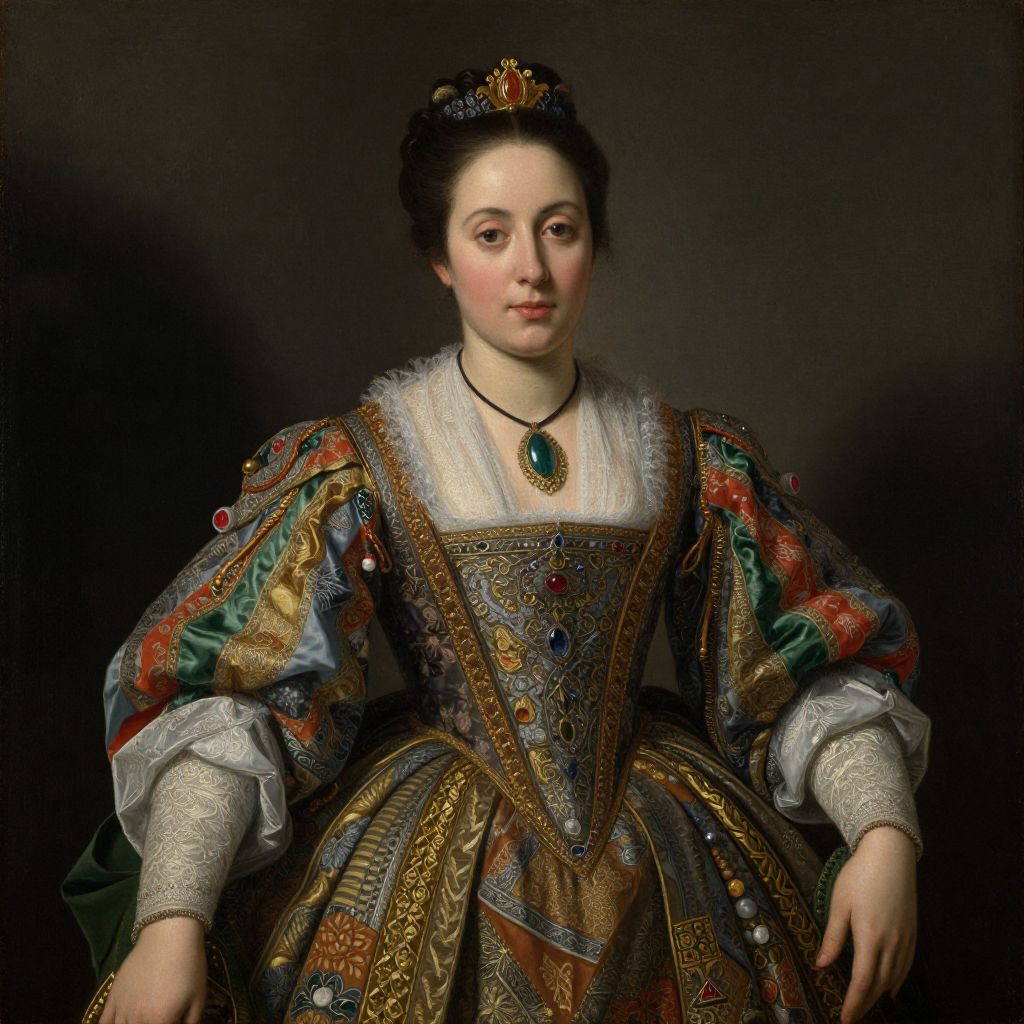 17th-century portrait of a fair-skinned noblewoman in elaborate, colorful Renaissance-style dress with intricate embroidery, puffed sleeves, green gem pendant,