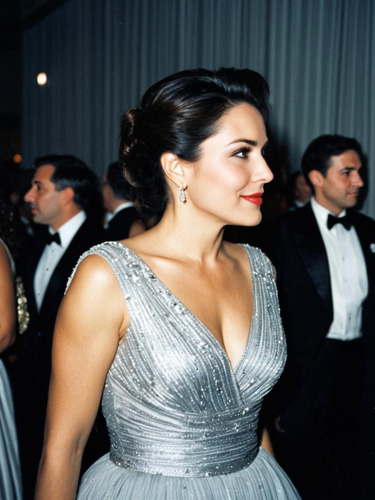 Black and white candid portrait of a young woman wearing a silver, beaded evening gown and elegant earrings at a formal gala event. The woman has light skin, her hair styled in an updo, and she is looking slightly to the side with a soft smile. In the background, a man in a tuxedo is visible, enhancing the formal atmosphere.
