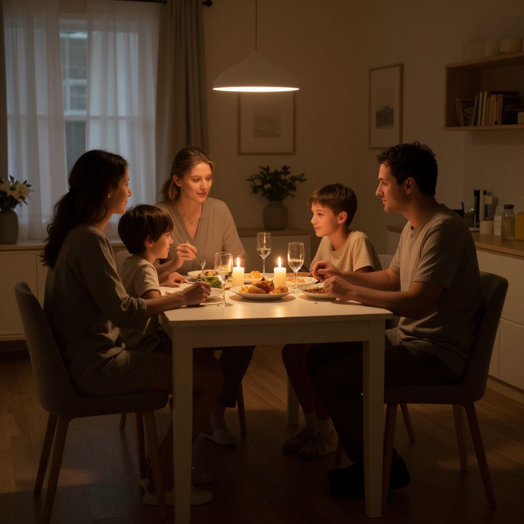 A quiet evening in a family home, with a small table set for two parents and their teenage child, sharing a simple but heartfelt dinner with candles flickering on the table.
