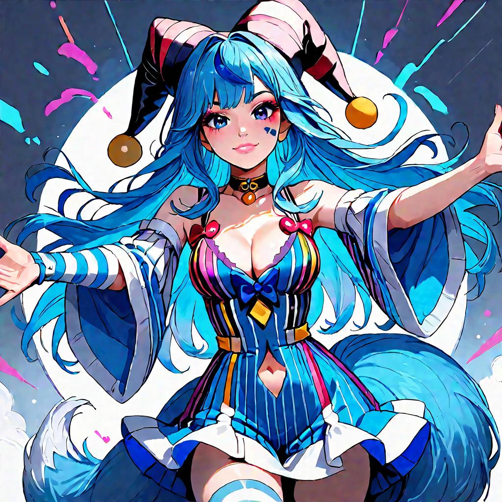 Score_9, score_8_up, source_anime, 1girl, solo, PolkaBase, streaked hair, fox ears, facial mark, long hair, side braid, purple eyes, jester cap, tilted headwear, blue hair bow, hair ornament, bow choker, striped dress, multicolored dress, navel cutout, cleavage, bare shoulders, elbow glove, single glove, striped thighhighs, fox tail, on stage, spread arms, :d, smile