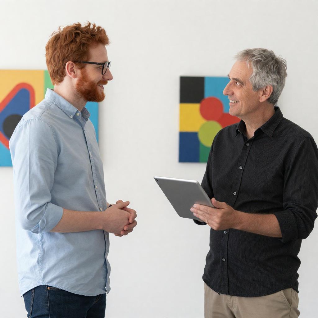 Two men standing, facing each other. Red-haired man in light blue shirt, glasses, smiling, hands clasped. Older man with gray hair, black striped shirt, holding silver iPad, smiling, hands open. Bright background with colorful abstract art.
