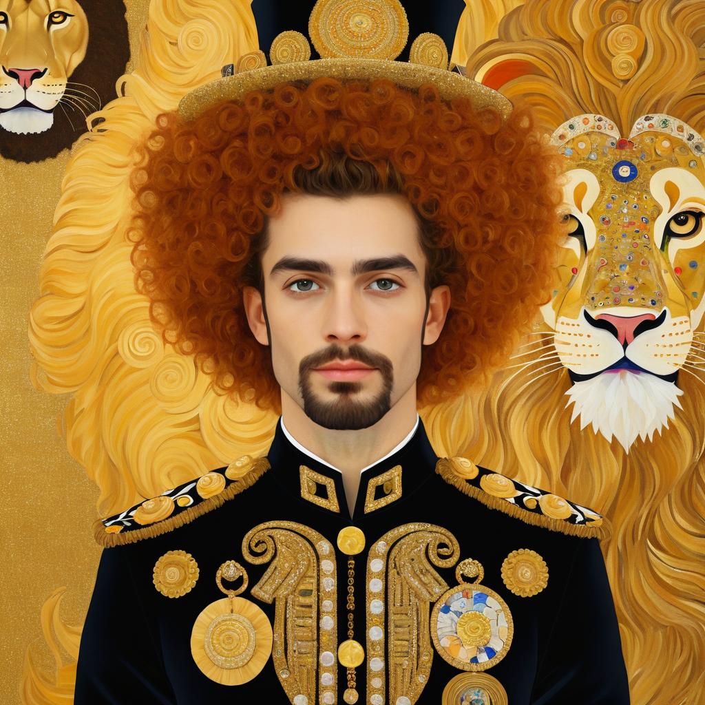 A detailed portrait of a lion tamer with curly red hair and a trimmed beard, dressed in a black jacket with gold ornate embroidery. The background features two decorative lions with golden manes, inspired by Gustav Klimt's intricate and realistic art style.