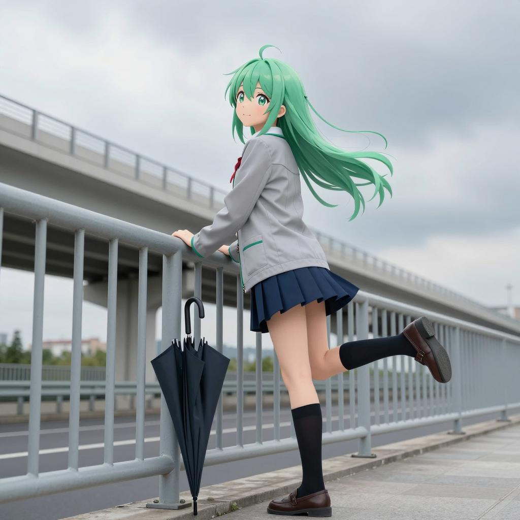 Anime girl with long green hair, gray jacket, blue skirt, black knee-high socks, brown shoes, leaning on metal railing. Background: overpass, road, cloudy sky. She smiles slightly, one hand outstretched, right leg raised. Umbrella on railing. Photographic style.