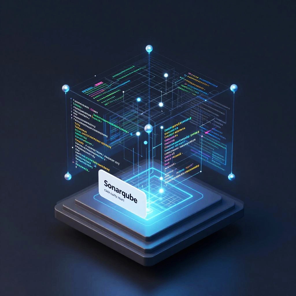 Sonarqube code quality report shown as a 3D data visualization floating in space, intricate network of code metrics, glowing lines, modern abstract technology background, futuristic and clean UI design, emphasis on software inspection and code health