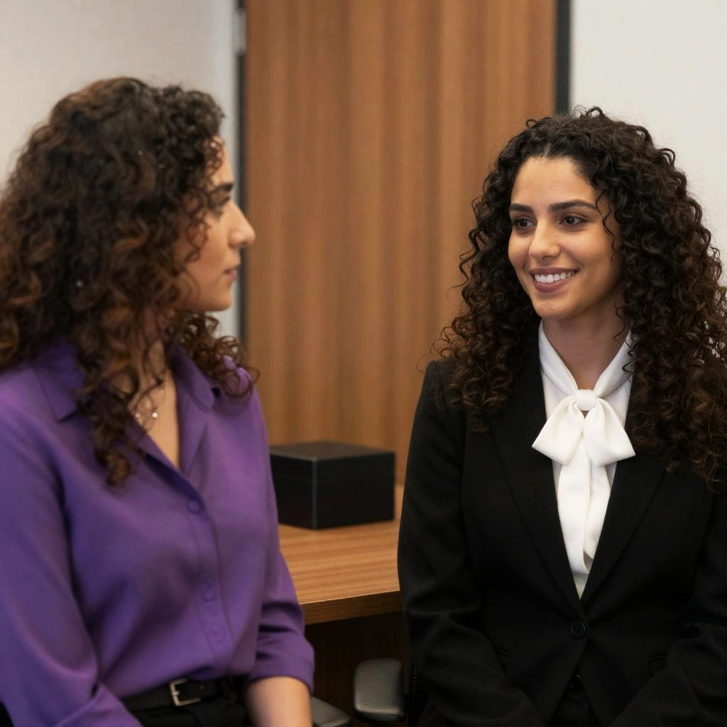 Photograph of two people in an office. Woman with curly brown hair, white headband, navy blazer, white bow tie, holding pen, looking to the left. Man with blonde hair, brown suit, writing with pen, looking at woman. Desk with phone, papers, green plant, wooden divider. Background has white walls, framed pictures. Woman's expression is attentive, man's expression is focused. Office setting with plants and wood accents. Two people.
