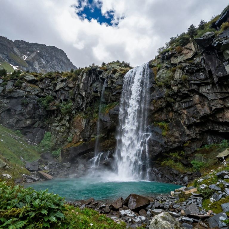 Cascada in a mountainous landscape, high altitude waterfall plunging dramatically from steep rocky peaks into a turquoise lagoon, surrounded by alpine flora and jagged cliffs, dynamic clouds above captured in photorealistic style with fine details