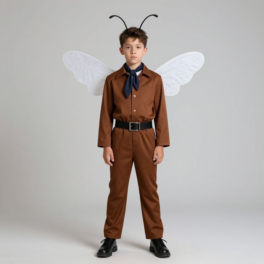 Photograph of a young boy standing against a plain white background. He has short brown hair and fair skin, wearing a brown long-sleeve shirt with a black bow tie and matching brown pants with a black belt. He is also wearing black shoes. The boy has transparent, insect-like wings attached to his back and black antennae on his head. His expression is neutral, and he is looking directly at the camera. The lighting is even, highlighting the boy and his costume details.