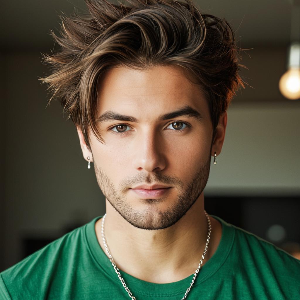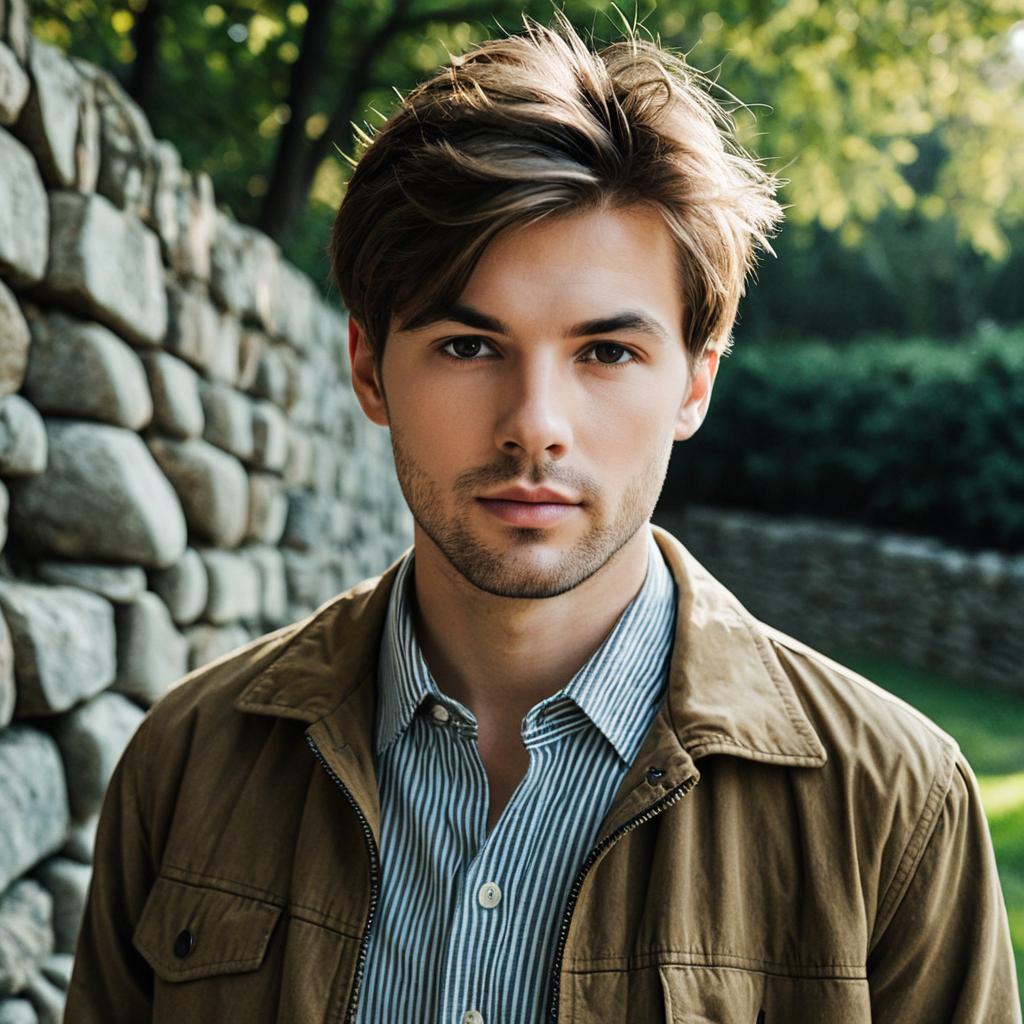 Close-up portrait of a handsome young man with medium-length brown hair styled casually, light green eyes, and light stubble. He is wearing a green military-style jacket over a blue denim shirt and a white t-shirt. The photo is taken outdoors with natural soft lighting and a blurred green background, showcasing a realistic and high-detail image.