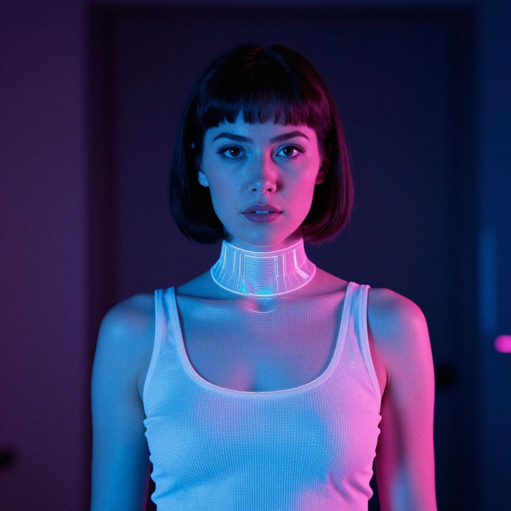 Photorealistic digital CGI image of a young woman with short, dark brown hair standing in a dimly lit, futuristic room. She wears a semi-transparent, ribbed, light gray tank top that reveals her natural form beneath. Neon blue and pink lights glow along her shoulders and neck, highlighting her upper body against the dark, blurry background. Her expression is neutral, with slightly parted lips and focused eyes. The overall lighting and color scheme evoke a cyberpunk aesthetic, emphasizing her futuristic, almost robotic appearance. The image has a high contrast between the illuminated lights and the dark surroundings.