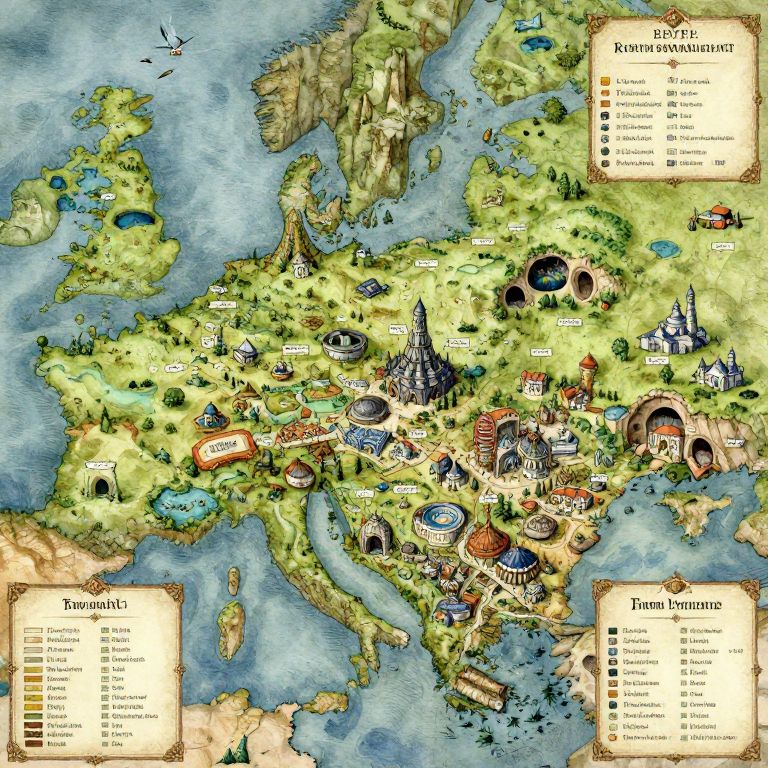 A colorful, detailed map in a fantasy style depicts a whimsical Europe, filled with various landmarks and features. The map is labeled "1870 Kingdoms of Europe" and includes cities, castles, forests, rivers, and mythical structures like dragon dens and ruins. Key locations are marked with symbols, such as a red castle, a blue river, and a green forest. The map is bordered with an aged parchment effect, featuring lists of "Towns" and "Famous Peoples" in the bottom left and right corners, respectively. The sea surrounding Europe is blue, and the land is lush with green and brown hues.