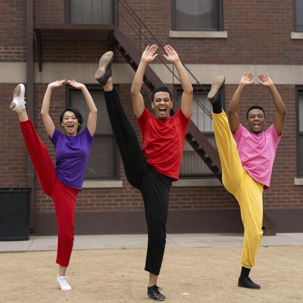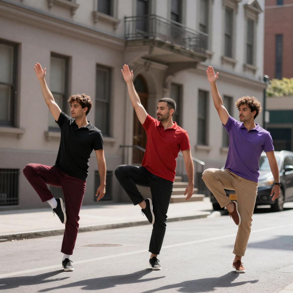 Three men dancing in an urban street. Mid-kick poses. Man on left in black shirt, burgundy pants, right arm raised. Man in center wears red shirt, black pants, left arm raised. Man on right in purple shirt, tan pants, right arm raised. Brownstone building background. Bright sunlight.