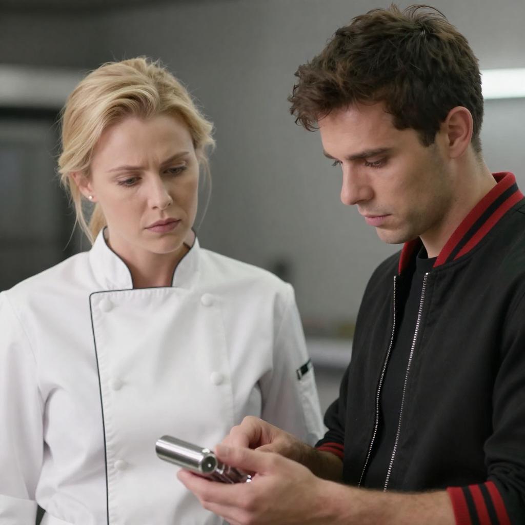 Photograph of a serious-looking blonde woman in a white chef's coat standing next to a dark-haired man in a black jacket with red stripes. The man holds a shiny metal object, focusing intently on it, while the woman looks slightly away. The background is a blurred, gray industrial setting.