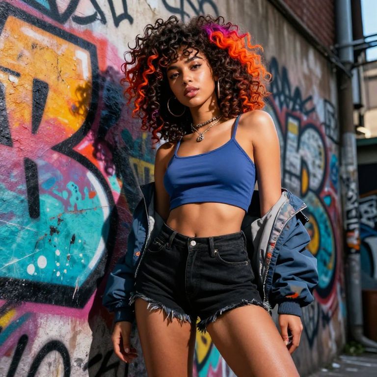 Photograph of a young woman with light brown skin and curly, vibrant red and black hair, standing against a graffiti-covered urban wall. She wears a blue crop top, black high-waisted denim shorts with frayed edges, and a partially open blue jacket. Her toned midriff is visible, and she has a necklace with a small pendant. The graffiti features colorful splashes and bold letters in orange, blue, and pink. The background includes a brick building and a narrow alley. The lighting is natural, highlighting her confident, street-style look.