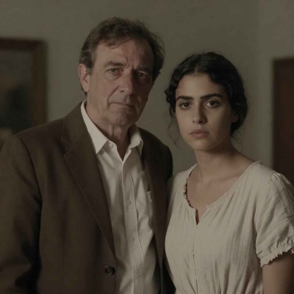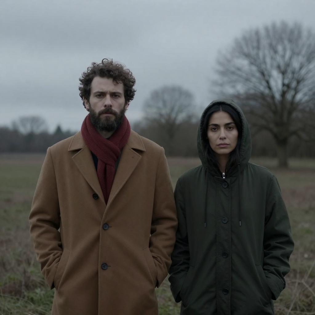 Photograph of a man and woman standing side by side in a dimly lit, outdoor field with a cloudy sky. The man has curly dark hair, a beard, and wears a brown coat with a red scarf. The woman has dark hair, a hood, and wears a dark green coat. Both have serious expressions. Leafless trees are in the background.