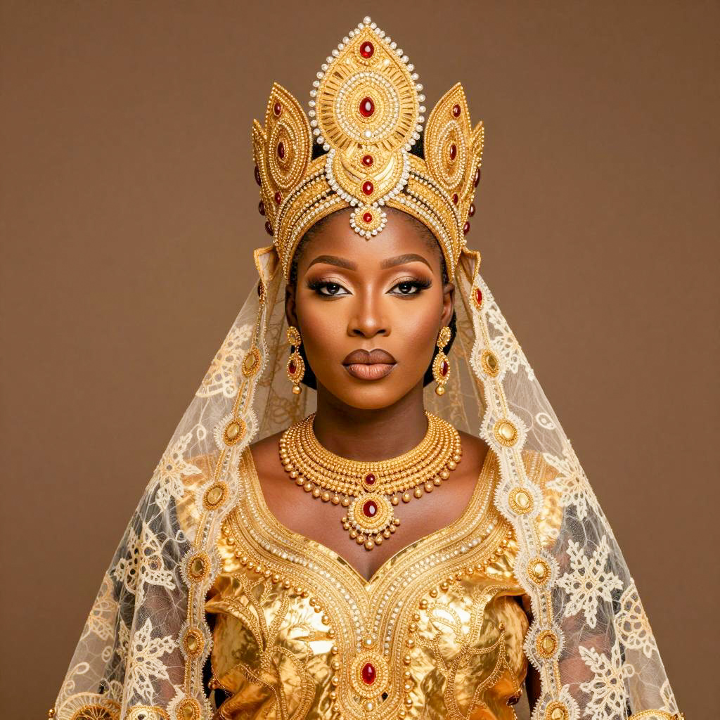 African woman in ornate, golden traditional attire. Large, intricate headdress with detailed patterns and small jewels. Transparent lace veil covers her head. Heavy gold jewelry including necklace, choker, and earrings. Dark skin, full lips, neutral expression. Centered in the image. Plain brown background. Photorealistic style.