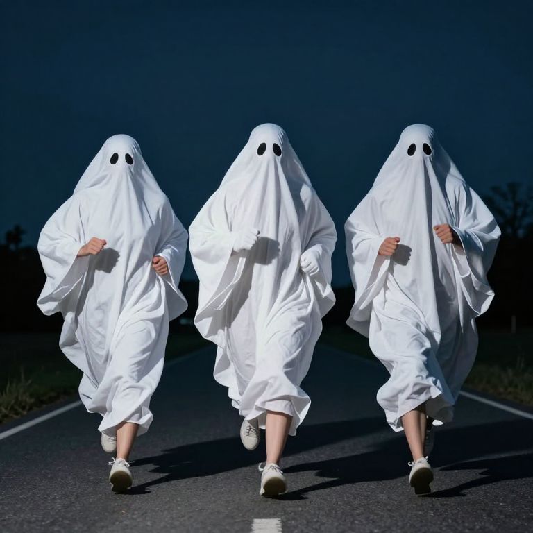 Three ghostly figures sprint down a darkened road, their white sheets billowing as they race forward with determined expressions, creating a surreal and humorous scene against a night sky.