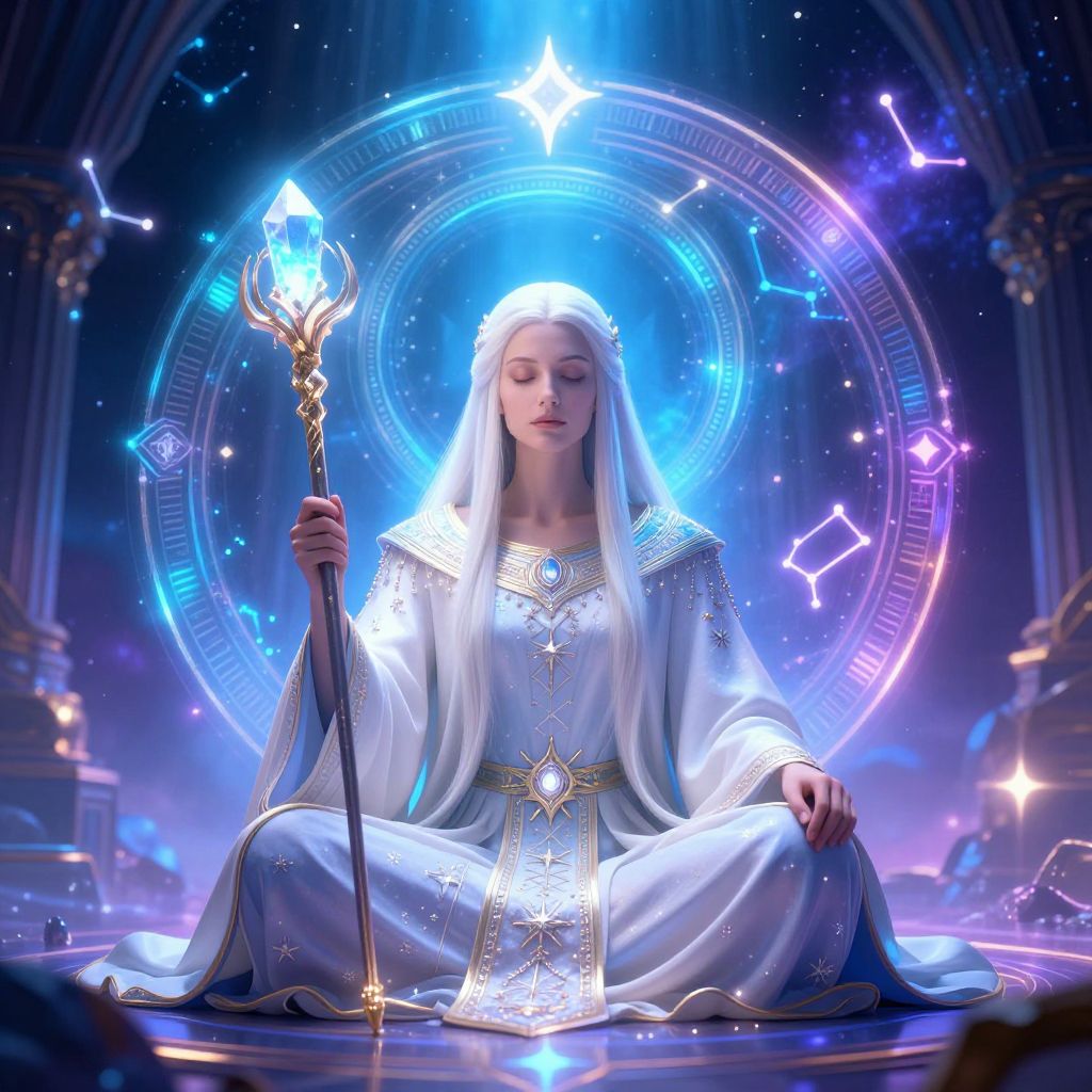 Digital artwork of a serene, pale-skinned woman with long, white hair and closed eyes, seated cross-legged on a glowing, circular platform. She wears an elaborate, silver-blue robe adorned with intricate gold patterns and a star-shaped gem at the chest. She holds a glowing, golden staff with a blue crystal at its tip. The background features a radiant, circular celestial pattern with glowing stars and constellations in shades of blue and purple. The scene is illuminated by ethereal light, creating a mystical, otherworldly ambiance. The woman's calm expression and the magical elements suggest she is a celestial or mystical figure.