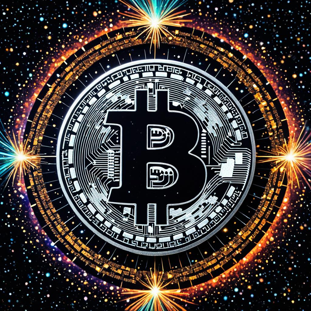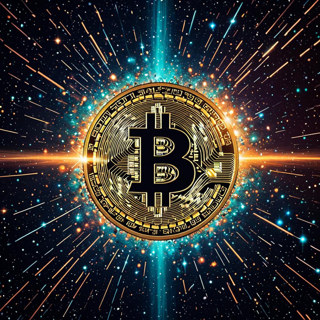 Digital artwork featuring the Bitcoin logo depicted as a cosmic entity surrounded by multicolor nebulae, sparkling neutrino bursts, cascading stellar flares, and embedded cosmic crystals, symbolizing the futuristic and digital nature of cryptocurrency.