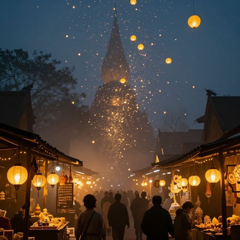 Photograph of a vibrant nighttime market scene with a tall, illuminated pagoda in the background. Warm, glowing paper lanterns hang above stalls on either side, casting a soft orange light. Silhouetted people walk through the market, which is filled with mist. Sparklers create a sparkling effect, adding a magical feel. The market stalls are adorned with various items, including baskets and decorative lights. The sky is a deep blue, enhancing the contrast with the lanterns and sparklers. Trees are faintly visible in the background.