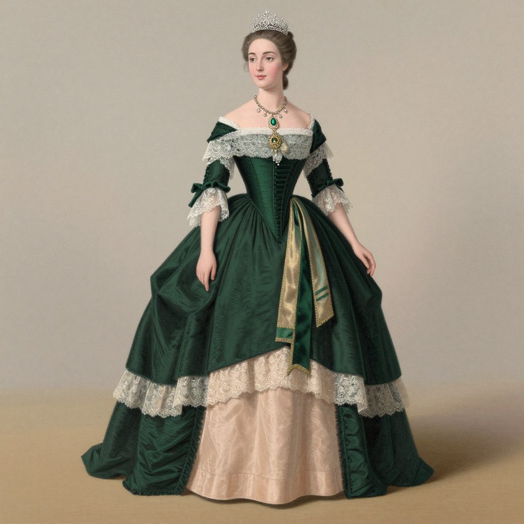 Elegant 18th-century attire showcased in a detailed illustration featuring a woman in a dark green gown with a fitted bodice, off-the-shoulder neckline adorned with lace, and a layered skirt in soft peach hues, complemented by a matching sash and intricate jewelry including a tiara and necklace.