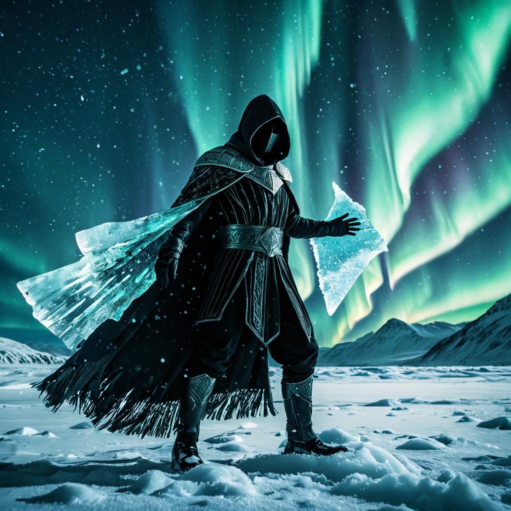 Shadowy assassin, cloaked figure in dynamic pose, swirling snowflakes, moonlit icy landscape, cinematic atmosphere, 4K resolution